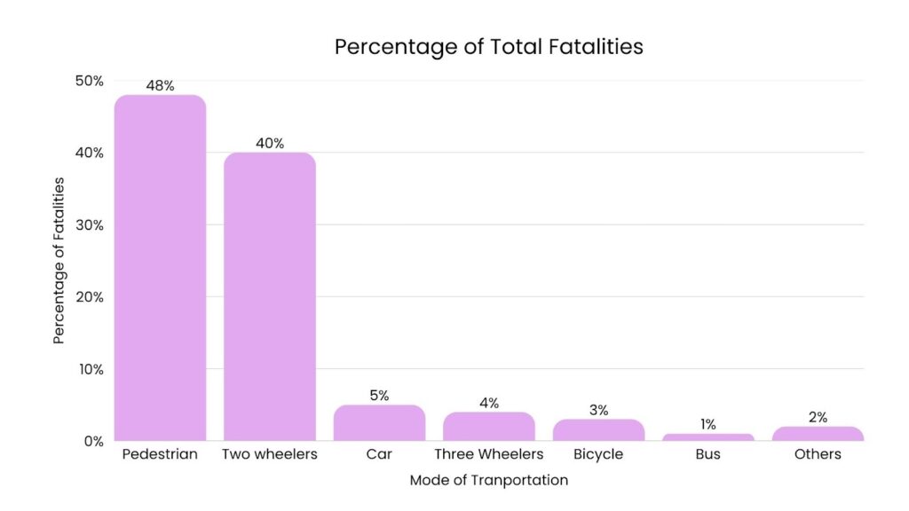 In Delhi, nearly half of all road crash deaths are pedestrians. In Chennai, the share of pedestrian deaths has shot up from just 11% of total fatalities in 2019 to 43% in 2023. This data shows that cities need to focus more on safe footpaths, crossings, and traffic management to cut these numbers.
