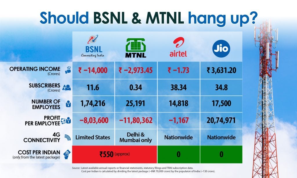 The government-owned telecom behemoths, BSNL & MTNL, are the epitome of inefficiency, bloated bureaucracy, and bad customer services. In addition, they cost the taxpayers thousands of crore rupees annually.