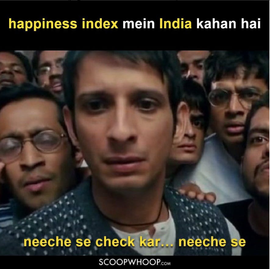 The 20th of March has been proclaimed as the International Day of Happiness by the United Nations General Assembly, following a High-Level Meeting on Well-Being and Happiness and the release of the first World Happiness Report in 2012. In India, most, I believe, are reminded of the day by news headlines that highlight how India is among the unhappiest nations. They may also be reminded by memes such as the following that showed up on my Instagram feed: