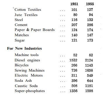 Let me make it clear that the overwhelming proportion of the increased production was contributed by Private Enterprise because the few State Enterprises which came into operation were mainly confined to the Sindri Fertilizer Factory, the Chittaranjan Locomotives, and the Indian Telephone Factory at Bangalore, etc. If you take the aggregate value of the production, contribution by the Public Sector represents a comparatively negligible percentage of the total. But the more interesting thing was this: if you break up the general index of industries and some of the new industries, taking 1946 as the base year representing 100, the increase has been for Old Industries: