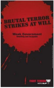 So, Lesson 5? A violent, gruesome, patch of blood to denote terror. Opportunistic piece. Printed in early 2009, after terrorist attacks during the UPA govt. All governments fail at tackling terror, but what new would L.K Advani add to prevent such acts? Let’s talk substance, not aggressive politics.
