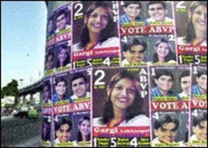 Akhil Bharatiya Vidyarthi Parishad (ABVP) is a DU Students Union party backed by the BJP. In a typical ABVP-NSUI poster, the fair & lovely pretty face take up much of the canvas. Lots of posters dawn the campus walls each year. Heights of self-obsession! As uncreative and ugly as mass-produce of posters could get. By the end of the polls, the friendly-neighborhood bhelpuri-seller uses them to sell his sumptuous bhel while scores of posters carpet the roads.