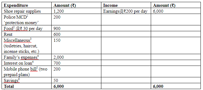 6Each year, he spends 30 to 45 days in his village. His savings are drawn down during this period. To ‘fund his vacation’ he does odd jobs in the village. Occasionally, Kishore borrows from and lends to his roommates on interest-free, short-term basis.